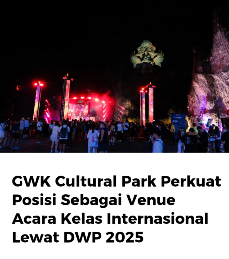 GWK Cultural Park kembali menunjukkan perannya sebagai salah satu destinasi unggulan penyelenggaraan acara berskala internasional dengan menjadi tuan rumah ajang musik elektronik terbesar di Indonesia, Djakarta Warehouse Project (DWP) 2025. Festival musik elektronik tersebut digelar selama tiga hari, mulai 12 hingga 14 Desember 2025, dan berhasil menarik ribuan pengunjung dari berbagai daerah di Indonesia maupun mancanegara. Kawasan GWK dipadati penikmat musik yang datang untuk menyaksikan penampilan deretan musisi elektronik ternama dunia, dengan latar megah Patung Garuda Wisnu Kencana yang menjadi ikon pariwisata Bali. Perpaduan antara skala produksi festival yang besar dan lanskap budaya yang kuat menjadikan DWP 2025 di GWK menghadirkan pengalaman unik yang tidak banyak ditemukan di venue lain. Sejak hari pertama pelaksanaan, antusiasme pengunjung terlihat tinggi, ditandai dengan arus kedatangan yang stabil dan suasana festival yang berlangsung meriah namun tetap terkendali.